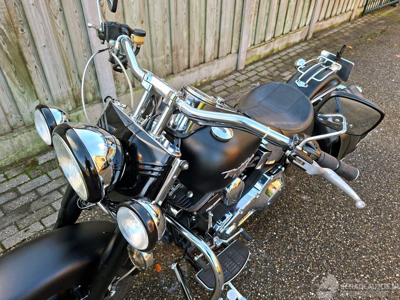 smoke knippers en custom zadel. Zwarte lederen koffers en veel chroomdetails maken het geheel compleet. Zichtbare gebruikssporen op enkele delen